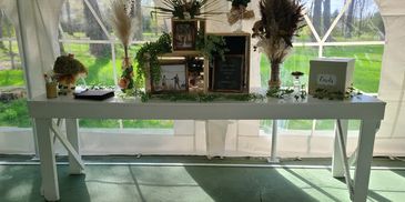 Table blanche pour décorations (table signature, cadeaux, gâteau, bonbon